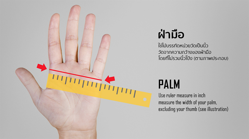 ใช้ไม้บรรทัดหน่วยวัดเป็นนิ้ววางในแนวราบ วัดจากความกว้างของฝ่ามือโดยที่ไม่รวมนิ้วโป้ง (ตามภาพประกอบ)